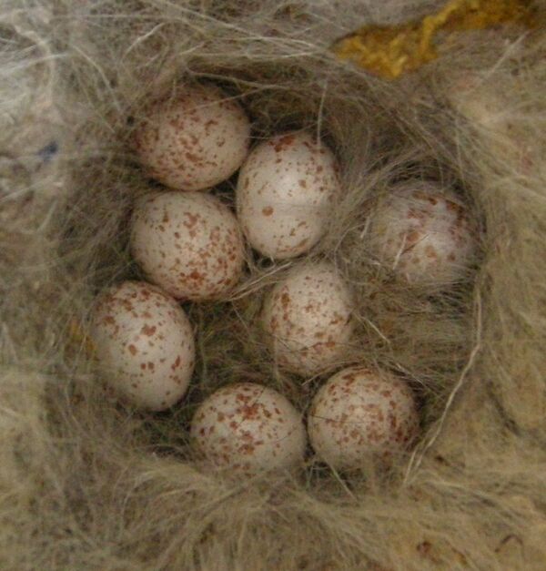 В сезон обычно две кладки, первая из которых на большей части ареала приходится на конец апреля — начало мая, а вторая — на июнь[3]. Полная кладка состоит из 5—12 яиц, при этом во второй раз птица обычно откладывает меньшее (обычно на 2 меньше) количество яиц, нежели чем в первый. В некоторых странах Западной Европы специалисты обнаружили интересный феномен — в районах с сильным загрязнением воздуха самка может насиживать пустое, без единого яйца, гнездо[11]. Яйца белые, со слегка блестящей скорлупой, с многочисленными красновато-коричневыми пятнами и крапинами. Размеры яиц (16—20) х (12—15) мм[12]. Самка сидит плотно в течение 12—14 дней, в то время как самец добывает корм и кормит её. При приближении к гнезду человека наседка громко шипит, а при непосредственной опасности взлетает и кружит над гнездом вместе с самцом. Выведшиеся птенцы на голове и спине покрыты серым пухом, полость клюва оранжевая. Потомство вскармливают оба родителя, принося им в гнездо в среднем 6—7 г пищи на каждого птенца в день. Птенцы находятся в гнезде 16—22 дней, после чего приобретают способность к полёту, однако ещё в течение примерно недели полностью зависимы от родителей. Даже спустя это время молодые птицы часто держатся недалеко от гнезда и время от времени подкармливаются родителями. Второй выводок держится вместе с родителями до 50 дней, когда с приходом осени птицы сбиваются в стайки. Максимально известная продолжительность жизни — 15 лет[2][4].