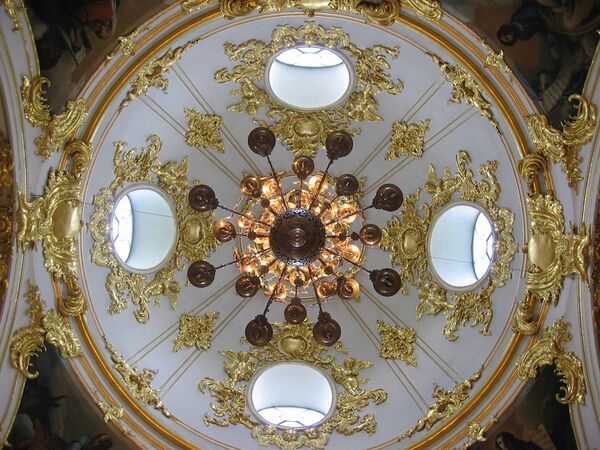 В январе 1756 года мастер Эйгер начал изготавливать деревянную модель купола, к отделке же интерьера приступили лишь несколько лет спустя: Растрелли представил одобренный чертёж «лепному и живописному украшению» церкви в 1759 году[3].