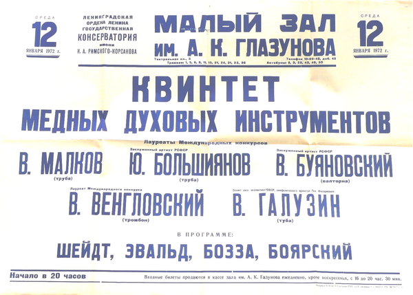 Валентин Малков, Юрий Большиянов (трубы) Аким Козлов, Виктор Венгловский и Николай Коршунов (тромбоны), Нина Оксентян (орган) на грампластинке «Музыка для духового ансамбля», запись 1971 года, Мелодия: № 133 - Андреа Габриэли. Ricercar del Duodecimo Tuono in B major. Ricercar del Sesto Tuono Фа мажор Юрий Большиянов (труба), Виталий Буяновский (валторна), Виктор Венгловский и Георгий Данилов (тромбоны) на грампластинке «Музыка для духовых», запись 1971 года, Мелодия: № 222