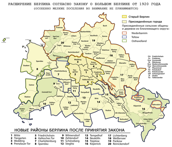 Закон о расширении границ Берлина (так называемый «закон о Большом Берлине», нем. Groß-Berlin-Gesetz был принят 27 апреля прусским ландтагом (164 — «за», 148 — «против») и вступил в силу 1 октября 1920 года. Согласно этому закону, в состав города Берлина включались шесть бывших внерайонных городов: Берлин-Лихтенберг, Берлин-Шёнеберг, Берлин-Вильмерсдорф (такие названия прилегающие к Берлину города Лихтенберг, Шёнеберг и Дойч-Вильмерсдорф получили ещё в 1912 году, хотя и оставались самостоятельными городами), Шарлоттенбург, Нойкёльн и Шпандау. Кроме того, в территорию Берлина вошли многочисленные поселения, отошедшие от прилежащих районов Нидербарним, Остхафельланд и Тельтов: город Кёпеник, 59 сельских общин и 27 земельный угодий. Кроме того, в Берлин вошёл земельный участок с берлинским Городским дворцом, который до сих пор являлся частным поместьем и не принадлежал никакой административной единице.