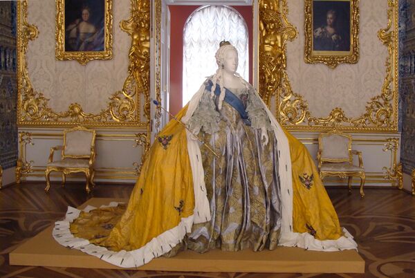 Традиционно дворец связывают и с именем Екатерины Великой, хотя сама императрица считала этот «взбитый крем» старомодным. Согласно воле покойной императрицы Елизаветы, первым делом Екатерина распорядилась позолотить статуи в парке. Когда часть из них уже обработали, узнав о стоимости этих работ, Екатерина велела их приостановить. В своих мемуарах она пожурила предшественницу за расточительство. Во всё своё царствование она перестраивала дворец и парк на свой вкус, делая их более удобными для жизни и более скромными.