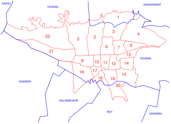 - город Тегеран как административная единица. Включает 22 муниципальных района (поделенных на 109 кварталов), из которых два района полностью, а один частично расположены за пределами шахрестана Тегеран. Общая площадь — около 730 км².
