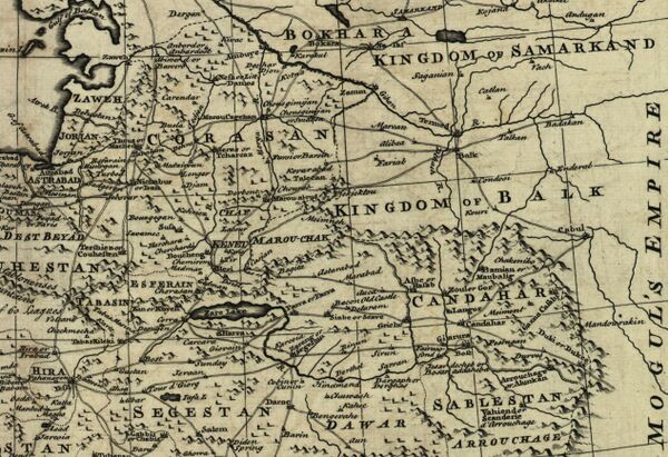 Люди Индостана зовут любую страну за его пределами «Хорасан», на тот же манер арабы используют для всего, кроме Аравии, обозначение «Аджам». На пути из Индустана в Хорасан два огромных рынка: один — в Кабуле, другой — в Кандагаре. Караваны из Ферганы, Туркестана, Самарканда, Балха, Бухары, Хиссара и Бадахшана делают непременную остановку в Кабуле. В это же время караваны из Хорасана шли в Кандагар. Эта страна лежит между Индостаном и Хорасаном[14].