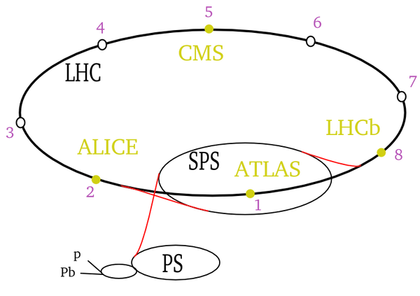 - Ускорение частиц продолжается в кольцевом ускорителе SPS (протонный суперсинхротрон), где каждая из частиц сгустка протонов приобретает энергию 450 ГэВ (0,999998 c). Ионный пучок же, пройдя через вторую фольгу и ионизировавшись полностью до состояния Pb29+, ускоряется в SPS до 177 ГэВ/нуклон.