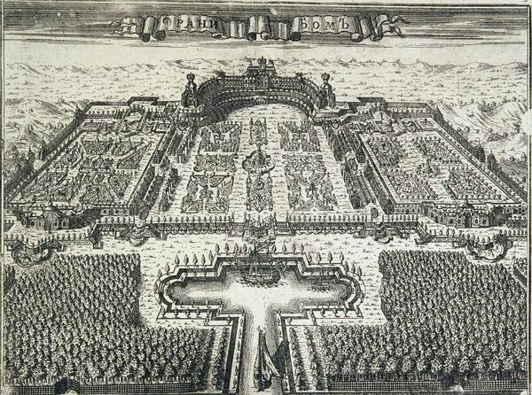 Заложенный в 1711 г. на вновь полученных землях, дворец строился поэтапно. Строительство велось под началом архитектора Д. М. Фонтаны, а в 1713 году его сменил И. Г. Шедель[3]. К 1716 г. был возведен центральный корпус здания, а тремя годами позднее завершилось строительство боковых павильонов. То, что уже к 1717 г. существовал проект такого облика дворца, доказывает гравюра А. И. Ростовцева. На ней дворец протянулся по краю естественной возвышенности. Длина главного фасада, обращенного к Нижнему саду и Финскому заливу, составляет 210 метров[4]. Центральная часть дворца двухэтажная, увенчана короной, к ней примыкают одноэтажные галереи, развернутые по дуге и заканчивающиеся павильонами. В работе над дворцом принимали участие И. Браунштейн, А. Шлютер, а также Н. Пино, которому, по-видимому, принадлежит идея скруглённых галерей, соединяющих дворец и боковые павильоны. К одному из них, западному, чуть позднее был пристроен длинный служебный кухонный флигель, протянувшийся на юг.
