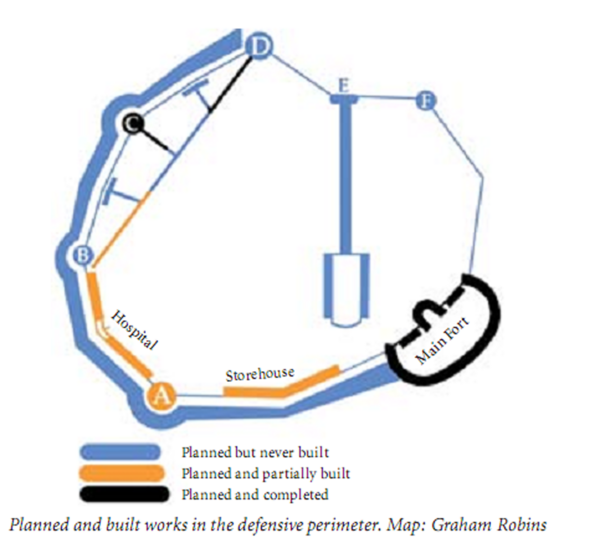 От главного форта на юго-востоке размещались (по часовой стрелке): укреплённый склад длиной 300 м, башня A, военный госпиталь длиной 300 м, башня B, первая батарея, башня С, вторая батарея, башня D, третья батарея, башня E, казармы для гарнизона и башня F. Все отдельные оборонительные сооружения должны были быть связаны друг с другом стенами, перед которыми находился гласис, защищавший здания и стены от пушечного огня. Каждое укрепленное здание было высотой в два этажа, а оборонительные башни — высотой в три этажа, что позволяло увеличить на 50 % количество орудий, которые могли быть направлены против неприятеля. Общее число планируемых пушек составляло 350 стволов.