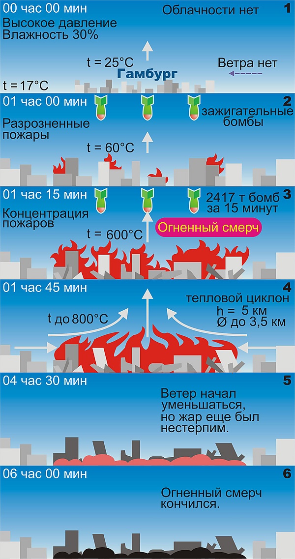 Температура поднялась до 600 ˚С. Образовался сверхнагретый наземный слой. Однако сам по себе воздух — плохой проводник тепла и за такой короткий промежуток времени не мог быстро прогреться в больших объёмах. Но в районе бомбардировки оказались городские каналы и озера. Водяные пары устремились вверх, нагревая воздушные массы. При отсутствии горизонтальных ветров сформировались мощные вертикальные потоки. В приземном слое атмосферы образовалась область пониженного давления. Свежие потоки кислорода стали притекать со всех сторон.