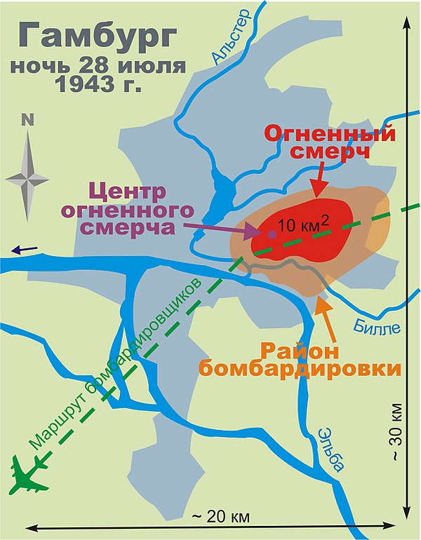 В районах Берлинские Ворота (Berliner Tor) и Вандсбекское Шоссе (Wandsbeker Chaussee) образовалось сплошное море огня высотой 30-50 метров.