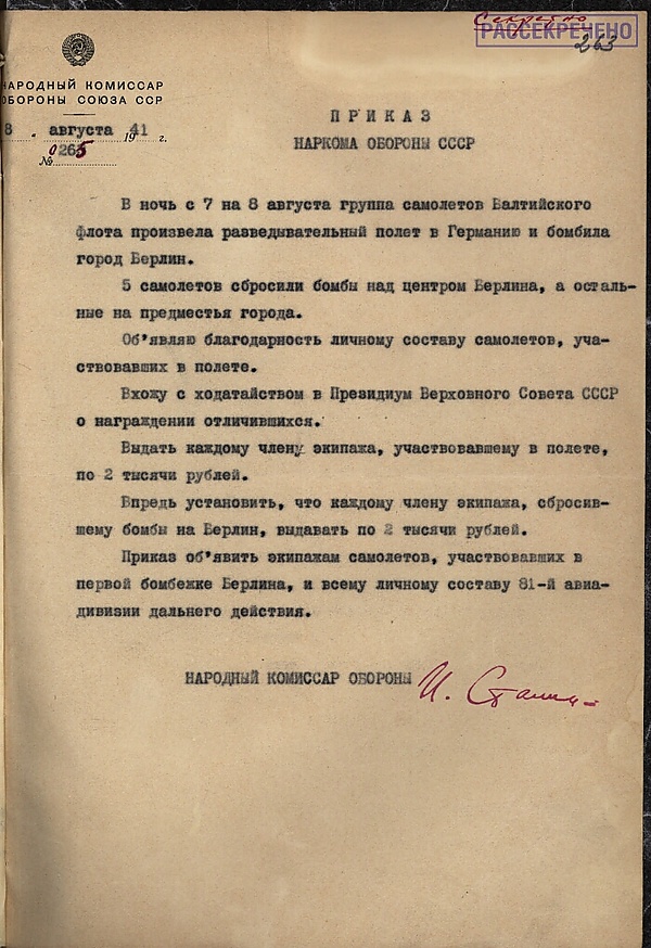 Обязать 81-ю авиадивизию во главе с командиром дивизии т. Водопьяновым с 9.08 на 10.08 или в один из следующих дней, в зависимости от условий погоды, произвести налёт на Берлин. При налёте кроме фугасных бомб обязательно сбросить на Берлин также зажигательные бомбы малого и большого калибра. В случае если моторы начнут сдавать по пути на Берлин, иметь в качестве запасной цели для бомбёжки г. Кёнигсберг.