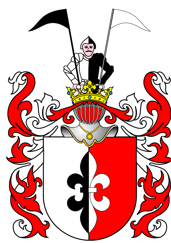 Двойная лилия двух цветов: белого и чёрного, расположенная так, что правая, белая, её половина в чёрном поле, а левая, чёрная, — в белом. Иногда в нашлемнике изображается воин, в полном вооружении, держащий на плечах два знамени.