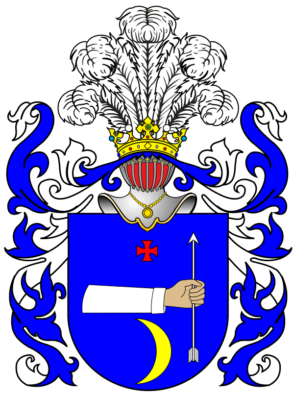 В голубом поле рука в белом рукаве, влево, держащая стрелу острием вверх; над локтем руки красный кавалерский крест, под локтем же золотой полумесяц рогами вправо. В навершии шлема пять страусовых перьев. Герб внесён в Гербовник дворянских родов Царства Польского, часть 1, стр. 87.