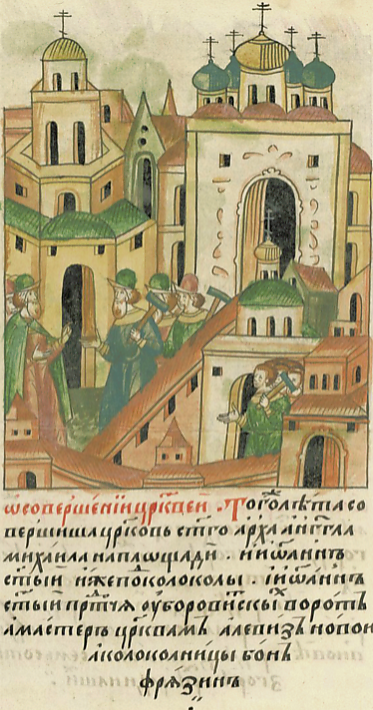 Того же лета [1508 год] свершиша церковь святаго Архангела Михаила на площади и Иоанн святый иже под колоколы и Иоанн святый Предтеча у Боровитских ворот, а мастер церквам Алевиз Новый, а колоколници Бон Фрязин[1].