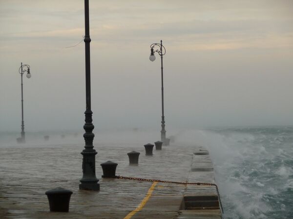 Он подымает воду в заливе и несёт её ливнями на дома. Море клокочет, как бы пытаясь взорваться. Ветер швыряет увесистые камни, сбрасывает под откосы товарные поезда, свёртывает в тонкие трубки железные крыши, качает стены домов.