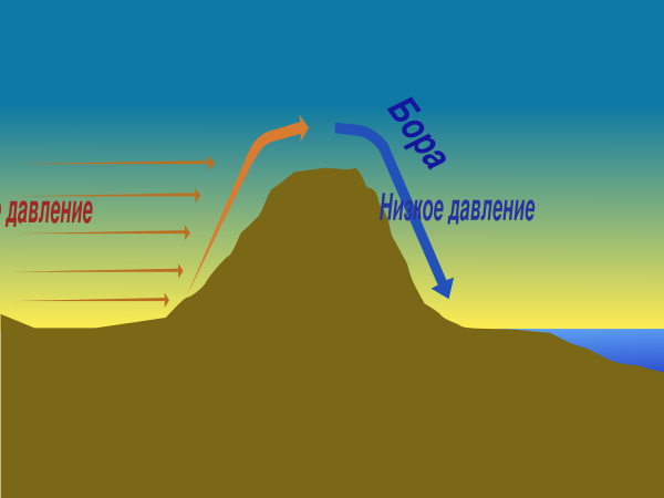 Бора возникает в Новороссийске и на побережье Адриатики в тех случаях, когда холодный атмосферный фронт подходит к прибрежному хребту с северо-востока. Холодный атмосферный фронт сразу же переваливает через невысокий прибрежный хребет. Под воздействием силы гравитации холодный воздух стекает по склону горного хребта, при этом приобретая большую скорость.