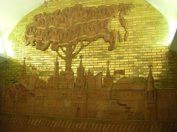 В глухом южном торце центрального зала размещено большое керамическое панно, посвящённое дружбе народов Советского Союза (художник И. В. Николаев)[1]. На панно изображено дерево с кроной в виде карты СССР, растущее из Московского Кремля. В кроне располагаются 15 поясных фигур людей в национальных костюмах, под каждой из которых размещена лента с указанием названия союзной республики. У подножия Кремля расположены колосья, а над Кремлём — кирпичное небо. Вся композиция исполнена в терракотовом цвете, за исключением золотых колосьев и неба[20]. Перед панно расположена чаша декоративного сухого фонтана с низким гранитным бортиком[21].
