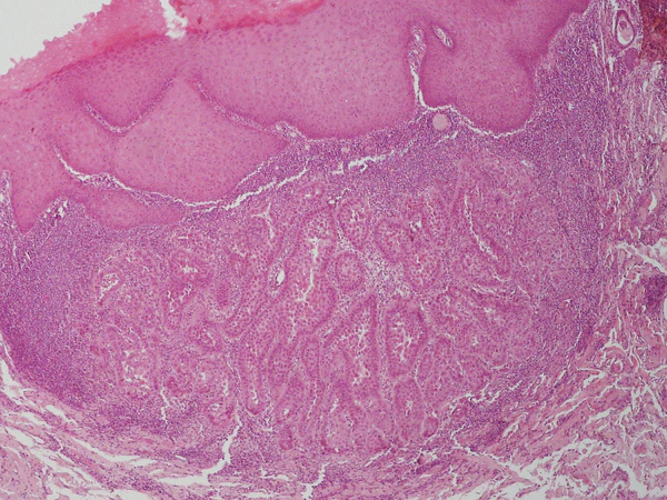 При подногтевой локализации обнаруживается кратерообразное углубление в области матрикса и ногтевого ложа с выраженным папилломатозом у основания, глубокими эпителиальными выростами, очагами акантоза, дискератоза и неровными супрабазальными расщелинами[3].