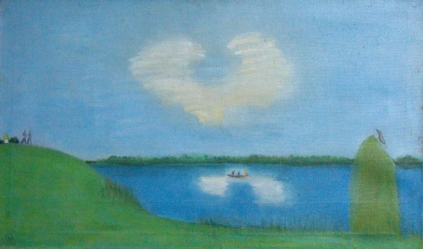 Картина представляет собой летний солнечный пейзаж с тщательно проработанной композицией. На первом плане справа изображён зелёный стог и полоса травы, слева расположен холм, на котором видны две фигуры. Вдали выделяется силуэт церкви. На втором плане центральное место занимает синее озеро, по которому плывёт лодка. В небе изображены белые облака, подчёркивающие ясную летнюю атмосферу.