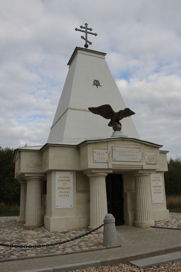 В августе 1839 года, к 25-летию победы над Наполеоном на Бородинском поле на батарее Раевского был открыт первый монумент-часовня в память защитников Отечества, сооружённый по проекту Антонио Адамини. Высота монумента вместе с крестом 27,5 метров. На его гранях содержится информация о численном составе обеих армий в день сражения, о «двунадесяти языков» армии Наполеона, о русских генералах, погибших в достопамятный день 26 августа 1812 года. Здесь же — выразительные тексты об отступлении русской армии к Москве, о вступлении французов в первопрестольную и русских войск — в Париж. Рядом с памятником у подножия монумента в июле 1839 года были захоронены останки князя Петра Ивановича Багратиона, перенесённые сюда по указу императора из села Сима Юрьев-Польского уезда Владимирской губернии.[1] Также, с целью проведения манёвров войск, принимавших участие в Бородинской битве, была восстановлена часть укреплений, расчищены окопы. В этом же году был освящён Спасо-Бородинский монастырь. В честь открытия Бородинского монумента-часовни в том же 1839 году была выпущена памятная серебряная монета номиналом полтора рубля[2].
