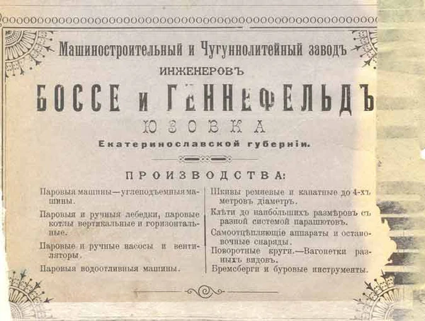 В 1889 году компаньоны Э.Боссе и Р.Геннефельд недалеко от Юзовки приобрели участок земли у помещика и шахтовладельца Н. А. Рутченко у села Григорьевки Бахмутского уезда Екатеринославской губернии для строительства машиностроительного и чугунолитейного завода. В том же году ими была приобретена и фабрика обёрточной бумаги в селе Петро-Марьевка на реке Лугань Бахмутского уезда Екатеринославской губернии (ныне г. Первомайск Луганской области Украина) для переоборудования в механический завод.