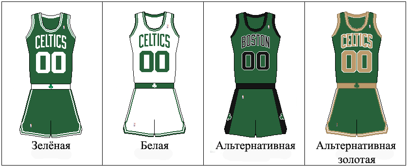 С момента основания в 1946 году баскетболисты «Селтикс» выходили на домашние игры в белой форме, а на выездные — в зелёной. За всю историю команды форма претерпела небольшие изменения, в основном в эру Билла Расселла[175]. Начиная с сезона 2005/06 годов «Бостон» впервые начал использовать альтернативную экипировку для выездных матчей. Цвет формы остался зелёным, но буквы с цифрами были выполнены в чёрном цвете вместо белого[176]. Поначалу игроки редко выходили на площадку в этой форме, но начиная с сезона 2007/08 годов «Селтикс» использовали эти цвета примерно в половине выездных игр[177]. В сезоне 2005/06 годов началась традиция играть в зелёной форме с золотой окантовкой в играх, которые проходят в период празднования Дня святого Патрика[175]. На первый матч сезона 2008/09 годов баскетболисты «Селтикс» вышли в зелёной форме с золотыми буквами и цифрами в честь победы в предыдущем чемпионате. Впоследствии она стала использоваться в качестве альтернативной выездной формы[175]. У «Селтикс» имеется традиция выходить на матчи в кроссовках чёрного цвета. По легенде, это внедрил Рэд Ауэрбах, которому не нравилось, что белые кроссовки легко пачкаются и выглядят некрасиво. Перед сезоном 2003/04 годов Пол Пирс предложил играть в белой обуви, потому что многие команды так же, как и «Бостон», стали выходить на матчи в кроссовках чёрного цвета. Рэд Ауэрбах согласился с Пирсом, и с тех пор баскетболисты «Селтикс» играют в белых кроссовках в домашних матчах и в чёрных в играх на выезде[178].