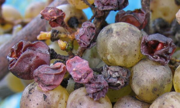 - Виноград: на ягодах появляются бурые пятна, которые затем покрываются густым серым налётом. В особых погодных условиях (чередование влажных и сухих периодов) гриб вызывает так называемую «благородную гниль», при которой ягоды заизюмливаются, а содержание сахара в них концентрируется. Такой виноград используется для производства десертных вин, например, сотерна[8].