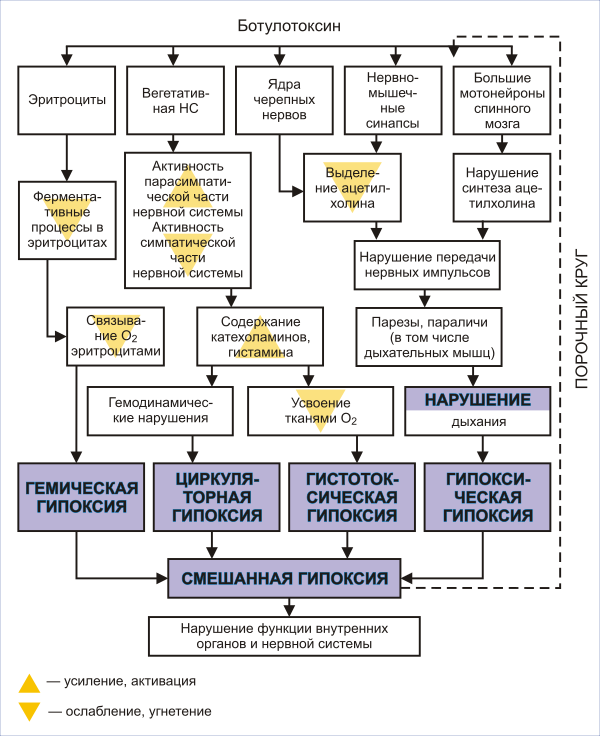 Также в патогенезе ботулизма большую роль играет гипоксия. Развитие прогрессирующей острой дыхательной недостаточности обусловлено угнетением активности больших мотонейронов передних рогов спинного мозга, иннервирующих дыхательную мускулатуру. Гипоксия нарастает при обтурации бронхов аспирационными рвотными массами, слюной и пищей, что связано с парезами мышц гортани, глотки и надгортанника. Из-за гипосаливации воспаляется слизистая оболочка ротоглотки, может развиваться гнойный паротит вследствие восходящей инфекции. Гибель обычно наступает от вентиляционной дыхательной недостаточности и иногда от внезапной остановки сердца. Токсинемия вызывает угнетение ферментов пентозофосфатного шунта, ингибирование клеточных Na+/K+ насосов и обусловливает развитие гемической гипоксии[4][6].