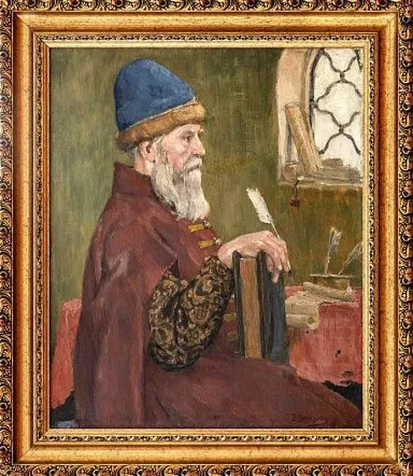 На картине изображён портрет знатного пожилого мужчины в красном кафтане с прямоугольными нашивками — «разговорами». Он сидит у письменного стола с пером в руках, вокруг лежат исписанные свитки.