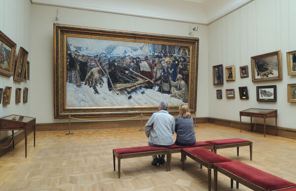 [Когда зрители проходят по основной анфиладе залов], они уже видят эту большую картину. И она уже втягивает их в это пространство своё, пространство красок, пространство величины этой картины, пространство образов. По морозной московской улице, заснеженной, запушённой снегом, снег голубоватый, едут сани, розвальни. В этих санях закованную в кандалы, колоды, точнее, закованную в цепи везут боярыню Морозову. Она вся в чёрном одеянии, а вокруг неё шумит московская улица, за ней, за санями, за боярыней Морозовой бегут люди, московский люд бежит. Здесь и ребятишки, здесь и просто любопытствующие, здесь горячо сочувствующие ей. Здесь юродивый, который повторяет этот жест боярыни Морозовой, нищенка, которая тянется за санями. Эта толпа вся соучаствует в этом событии. И мы становимся тоже невольными не просто соучастниками, свидетелями того, что видим, а мы входим в эту внутреннюю атмосферу картины.