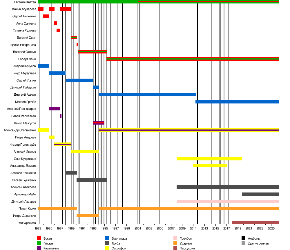 - Александр Степаненко — клавишные, саксофон, флейта, губная гармоника, гитара (lap steel), аккордеон (1983—1985, 1994 — наст. время)