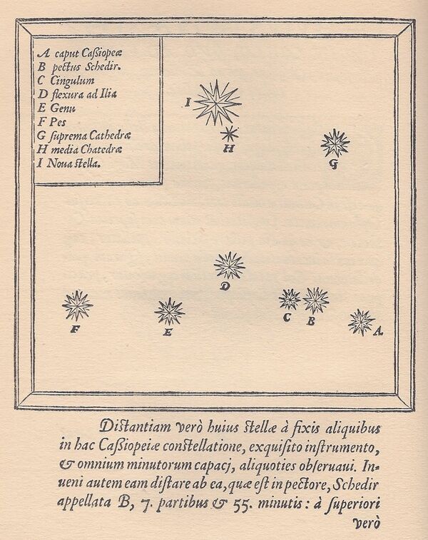 11 ноября 1572 года Тихо Браге, возвращаясь домой из химической лаборатории, заметил в созвездии Кассиопеи необычайно яркую звезду, которой раньше не было. Он сразу понял, что это не планета, и стал измерять её координаты. Звезда сияла на небе ещё 17 месяцев; вначале она была видна даже днём, но постепенно её блеск тускнел. С этого момента Тихо Браге вернулся к астрономии. В современной терминологии, это была первая за 500 лет вспышка сверхновой в нашей Галактике; следующая произошла вскоре после смерти Браге (Сверхновая Кеплера), и больше в Галактике вспышек сверхновых, видимых невооружённым глазом, не наблюдалось[16] (лишь в 1987 году неподалёку, в Большом Магеллановом Облаке, отмечена вспышка сверхновой SN 1987A).