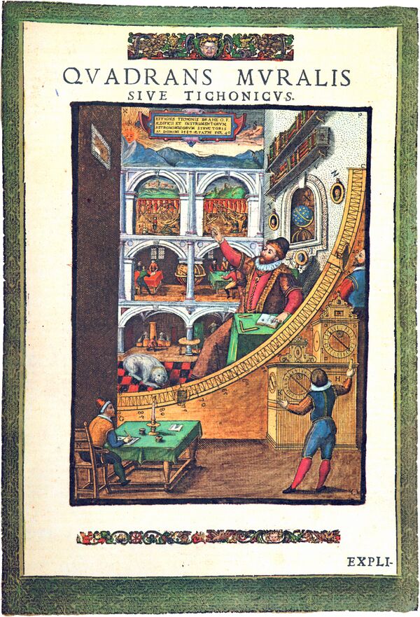 Браге назвал свою обсерваторию «Ураниборг» («Замок Урании») в честь музы астрономии Урании; часто это название переводится как «Небесный замок»[24]. Браге сам составил проект сооружения, прототипом которого, как полагают историки, послужила одна из работ знаменитого итальянского архитектора Андреа Палладио, с которой Браге ознакомился во время путешествия по Италии. В плане замок представлял собой квадрат со стороной около 18 метров, точно ориентированный по сторонам света. Основное здание имело 3 этажа и подвал. В подвале размещались алхимическая лаборатория и различные склады. На первом этаже — жилые помещения и библиотека; здесь же хранились любимый небесный глобус и ещё один предмет гордости Браге — стенной квадрант. На втором этаже были 4 обсерватории с раздвижными крышами, выходящие на все стороны света. Третий этаж занимали комнаты сотрудников и учеников. Небезынтересно, что Браге устроил в Ураниборге даже такую редчайшую в те годы роскошь, как водопровод на всех этажах. Во дворе располагались вспомогательные здания — типография, мастерские, комнаты для слуг и др. Среди сотрудников Браге была его любимая сестра София, талантливый астроном, врач и химик, которую Браге в шутку называл Уранией[25].