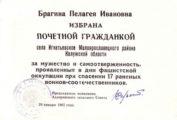 В архиве Пелагеи Брагиной сохранилась записка председателя колхоза от 8 августа 1952 года её матери, Т. С. Брагиной, которой тогда было около 70 лет: