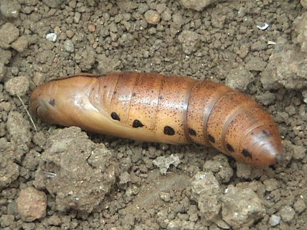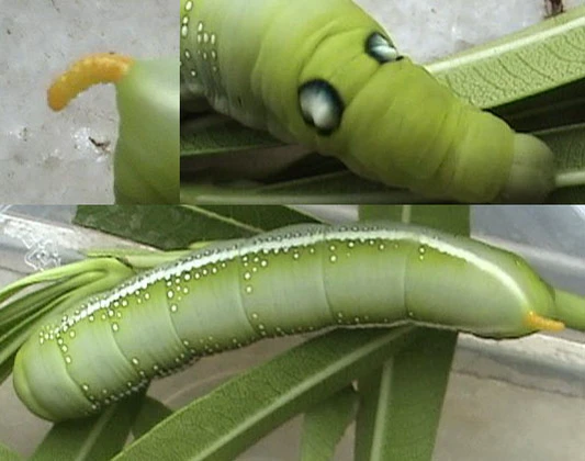 Гусеница зелёная или желтоватая; на каждой стороне третьего членика по точкообразному глазчатому пятну с белою серединою и чёрно-синим краем; позади третьего членика белая продольная линия; дыхальца с жёлтою оторочкою, хвостовый рог короткий, приплюснутый. Встречается на олеандрах и иногда на барвинке (Vinca). Гусеницы окукливаются на земле у олеандров, в коконе, состоящем из обломков листьев.