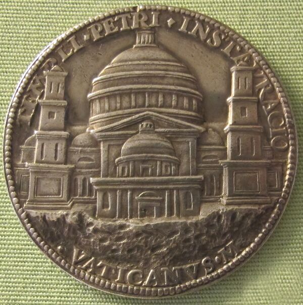 Главная работа Браманте в Риме для папы Юлия II — разработка с 1505 года первого проекта новой базилики Святого Петра. Проект Браманте, известный по рисункам Сангалло и Серлио, и по медали Карадоссо, представлял здание с центрическим планом, куполом, поддерживаемым барабаном и окружённым четырьмя башнями. Браманте утверждал, что стремился водрузить купол Пантеона (символа древнеримской классики) на своды Храма Мира (так называли в то время базилику Максенция-Константина на Римском Форуме). Проект ватиканского храма, разработанный Браманте, следовал центрическому типу крестово-купольных зданий. В основу плана положен «греческий крест», заключённый в квадрат, на углах которого (в одном из вариантов проекта) Браманте предполагал поставить четыре высокие башни. Очевидно, что архитектор пытался соединить византийский тип церкви с традициями романской архитектуры и создать тем самым некий «вселенский храм». Можно также предположить влияние идей Леонардо да Винчи и его рисунков идеального центрического храма. Творчество Браманте — одна из вершин архитектуры Возрождения[8].