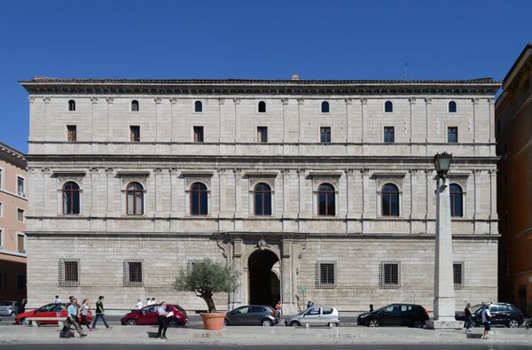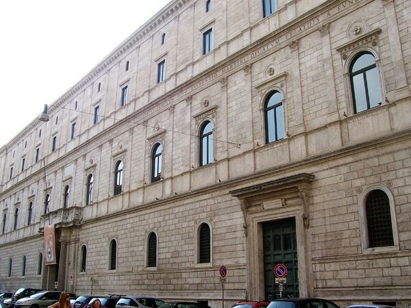 - Палаццо Канчеллериа (1483—1513). Проект Д. Браманте. Строительство А. Бреньо. Фасады протяженные, из травертина, взятого из облицовки древнеримского Колизея, с имитацией руста и характерными брамантовыми окнами. Композиция фасадов по горизонтали делится на три яруса, по вертикали — пилястрами с капителями коринфского ордера. Двор оформлен двухъярусной аркадой типа лоджии. Первые два яруса — аркады с колоннами тосканского ордера, третий ярус — пилястры. Гранитные колонны первого яруса взяты из старой церкви Сан-Лоренцо-ин-Дамазо.