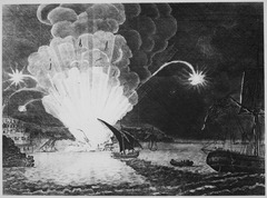 - 26 июня (7 июля) 1770 года, когда во время Чесменского боя брандер под командой лейтенанта Д. С. Ильина сцепился с турецким кораблем и был подожжён, а затем пожар распространился далее и сцеплённые корабли взорвались. Турки тогда потеряли 16 линейных кораблей, 6 фрегатов, до 50 мелких судов и до 10 000 человек убитыми, тогда как потери Русского императорского флота составили от 534 до 661 человек. Однако брандер Ильина был единственным, который добился успеха в том сражении, а всего их было отправлено четыре, три других никакого серьёзного ущерба неприятелю нанести не сумели[8][5].