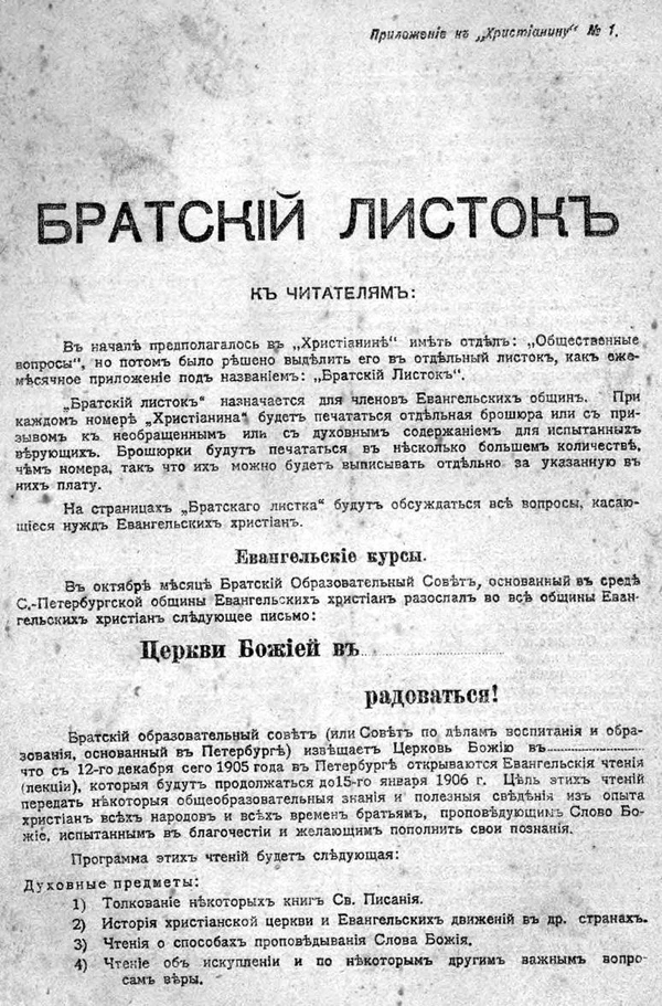 "В начале предполагалось в «Христианине» иметь отдел: «Общественные вопросы», но потом было решено выделить его в отдельный листок, как ежемесячное приложение под названием: «Братский листок».