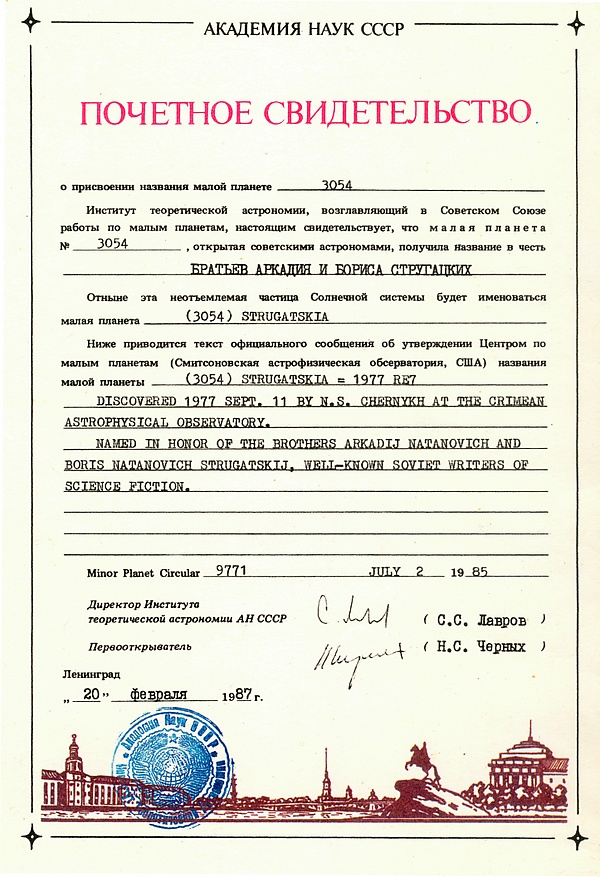 - Именем Стругацких назван астероид № 3054, открытый 11 сентября 1977 года в Крымской астрофизической обсерватории.