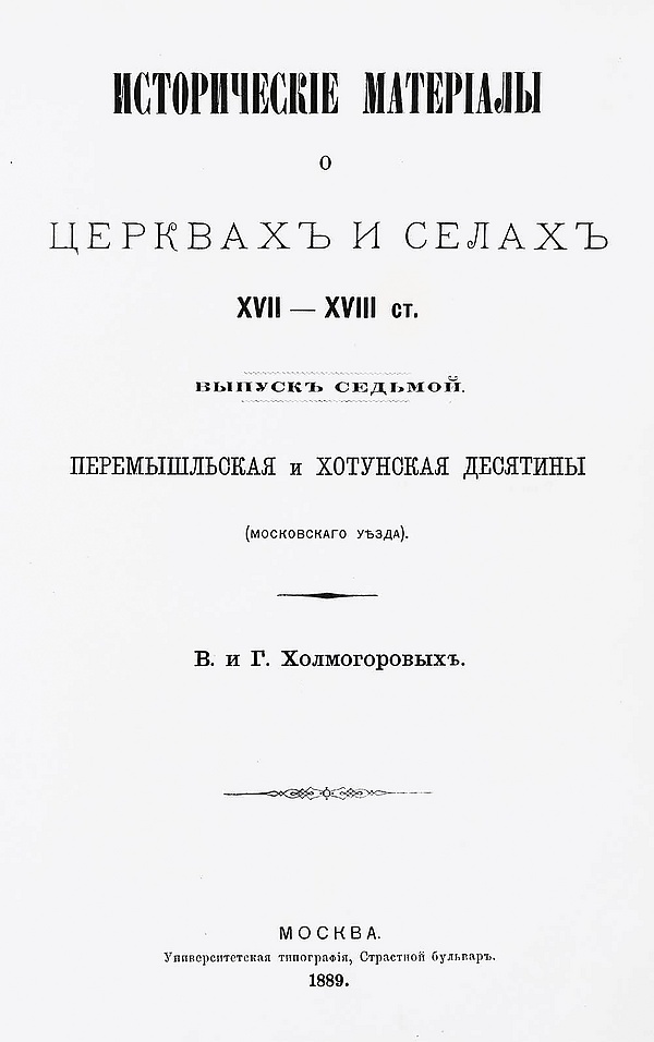 - Холмогоровы В. и Г. Исторические материалы о церквах и сёлах XVII—XVIII ст. Выпуск седьмой. Перемышльская и Хотунская десятины (Московского уезда).. — М.: Университетская типография, 1889. — IV, 165 с.