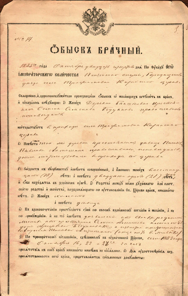 В 1765 году венечные памяти были упразднены Сенатским указом «Об уничтожении венечных памятей и денежного сбора с оных и о произведении обысков прежде венчания вступающих в брак»[3]. Указом вводились брачные обыски — акты, составляющие содержание обыскных книг. В конце XIX — начале XX века брачный обыск получил второе название — предбрачное свидетельство.