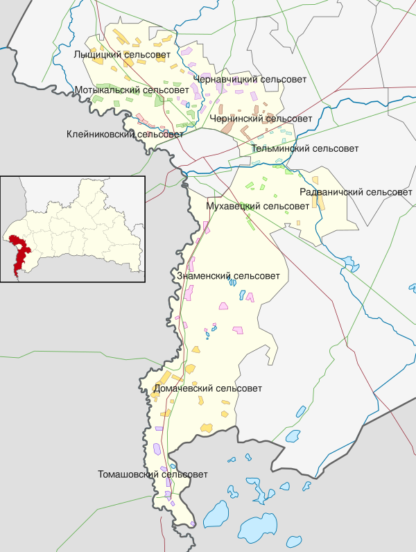 В состав района входят городской посёлок Домачево и 141 сельский населённый пункт. Район делится на 11 сельсоветов[17]: