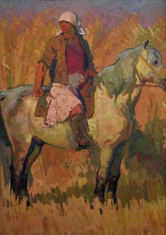 На фоне высоких золотисто-жёлтых колосьев изображена женщина, сидящая на лошади. Она одета в белый платок, расстёгнутую коричневую куртку, из-под которой видна бордово-фиолетовая жилетка, светлую юбку и сапоги. Левой рукой женщина держит уздечку животного. Композиция подчёркивает индивидуальные особенности персонажа и сочетает элементы портретного и пейзажного изображения.
