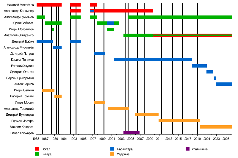 - Максим Васильев — гитара, тексты (с 1986 года, до сих пор пишет тексты для группы, например, большая часть альбома «Никакой правды»)