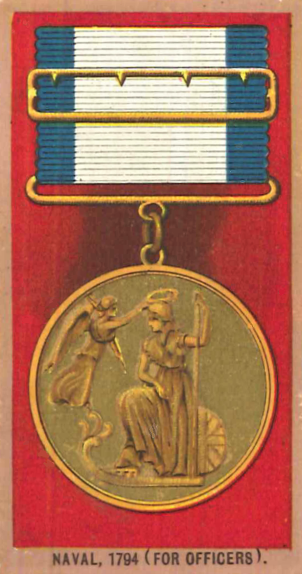 | Золотая военно-морская медаль | 1794 | Действия на море в 1793—1815 годах, в том числе Французские революционные войны, Наполеоновские войны и Англо-американская война. Для старших офицеров. | 22 больших, 117 малых | |||