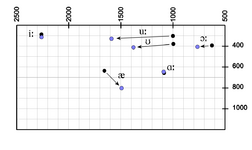 Сравнение формант звуков /iː æ ɑː ɔː ʊ uː/ в речи старых (тёмно-синий) и молодых (голубой) носителей RP. По де Йонг (2007, стр. 1814) - Между парами слов вроде hoarse и horse раньше была разница в произношении за счёт добавления дифтонга /ɔə/, к примеру, в hoarse, force, и pour[74]
