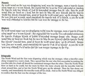 В издании Journal of the International Phonetic Association регулярно публикуются так называемые иллюстрации к международному фонетическому алфавиту (IPA illustrations), позволяющие на примерах показать особенности фонетики того или иного языка или акцента. Подобные иллюстрации традиционно базируются на басне Эзопа о северном ветре и солнце[87]. Ниже приведена аудиозапись из журнала с голосом женщины, родившейся в 1953 году и обучавшейся в Оксфордском университете — пример британского нормативного произношения.