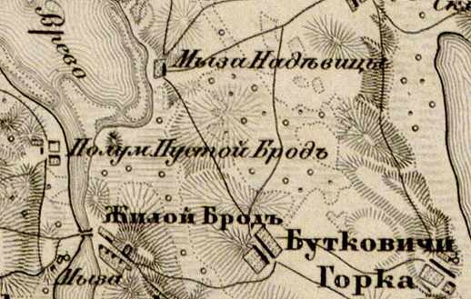 БРОД ЖИЛОЙ — деревня владельческая при озере Вреве, число дворов — 12, число жителей: 56 м. п., 67 ж. п.[6] (1862 год)