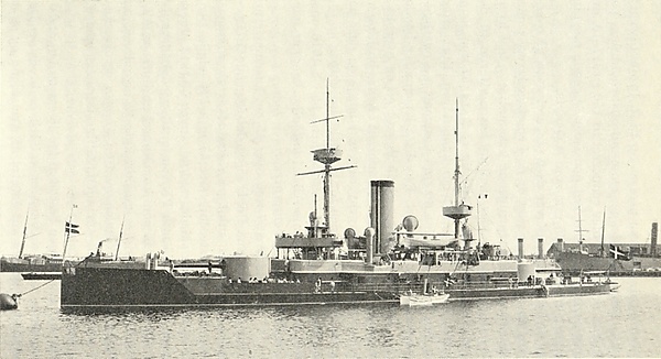 В 1895 году норвежский стортинг официально объявил тендер на приобретение двух малых броненосцев, который выиграла известная британская компания «Армстронг»[36]. Спроектированные известным конструктором Филипом Уоттсом, два броненосца типа «Харальд Хаарфагрфе» были заложены в марте 1896 года на верфи компании в Эльсвике и переданы заказчику в 1897—1898 годах[37]. Это были небольшие корабли, водоизмещением менее 4000 тонн, развивавшие неплохую, по меркам конца XIX века, скорость около 17 узлов и имевшие главный калибр из двух 210-мм орудий, размещавшихся в башнях в носу и корме. Пушка стреляла 140-кг снарядом и представляла существенную опасность для любого крейсера. В дополнение имелся средний калибр, включавший шесть 120-мм скорострельных орудий[36].