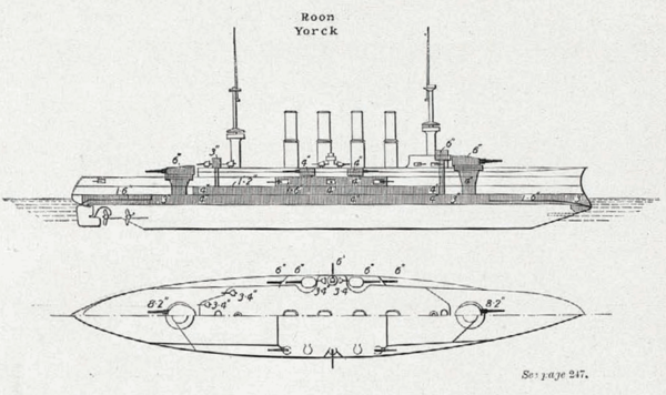 «Йорк»[ком. 2] — заложен в 1903, спущен 14 мая 1904, вступил в строй 21 ноября 1905 года. 21 мая 1913 года «Йорк» вышел в резерв. Вновь в строй вошел с 12 августа 1914 года, оставался в Северном море, в 3-й Разведывательной группе, охранял берега Северного моря. 4 ноября 1914 года возвращаясь из похода в густом тумане в устье Яде крейсер наткнулся на две мины немецкого минного заграждения. Он быстро опрокинулся и затонул на фарватере. Из 712 человек, бывших на борту, погибло 336[1].