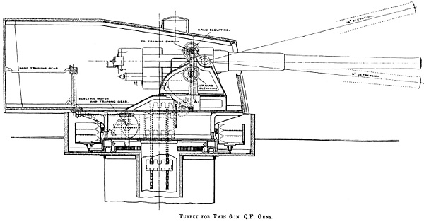 На этих английских броненосных крейсерах 152 мм пушки Mk VII (новую модель они не получили) располагалась в двухорудийных башнях и казематах. Про эти крейсера ходила шутка: «Сэр Ульям Уайт спроектировал крейсера класса Каунти, но забыл про пушки». Башни страдали от ненадёжности электрооборудования, замыканий, заливания водой, из-за тесноты и задымления. В результате скорострельность двух стволов в башне была ниже скорострельности одного орудия, установленного открыто. Установка двух стволов в одной люльке давала большое рассеивание. Проблема усугублялась тем, что из оставшихся десяти шесть 152 мм орудий располагались в нижних казематах — это не позволяло вести огонь при волнении[11].